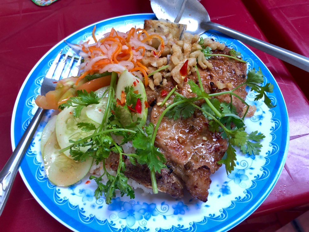 Cơm tấm sườn – broken rice with grilled pork chop, is a very common breakfast, beside Phở and bánh mỳ. It has to be broken rice to get the right flavor to the dish. The broken rice absorbed the sweet and spicy sauce which made with fish sauce, sugar, chills, and garlic. The pork chop was marinated overnight with garlic, lemongrass, brown sugar and soy sauce. It then will be grilled on the charcoal on the morning. Just follow the smell and smoke, you will find the restaurant in a hidden valley. The small family restaurant just served breakfast until they sold out, usually, around 10 am.