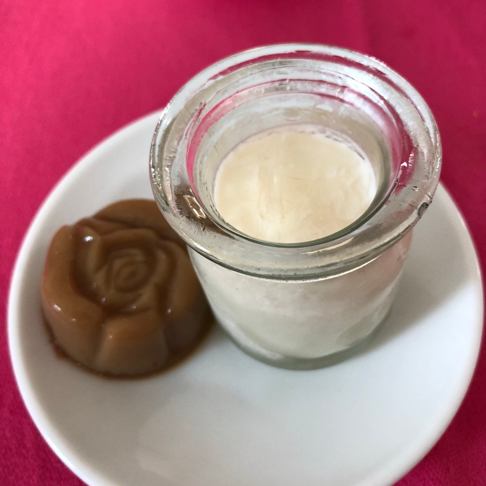 Da ua- yogurt, is very popular in Vietnam. Mostly homemade from whole milk, very creamy and delicious. Next by is a small chocolate agar in the shape of a rose.