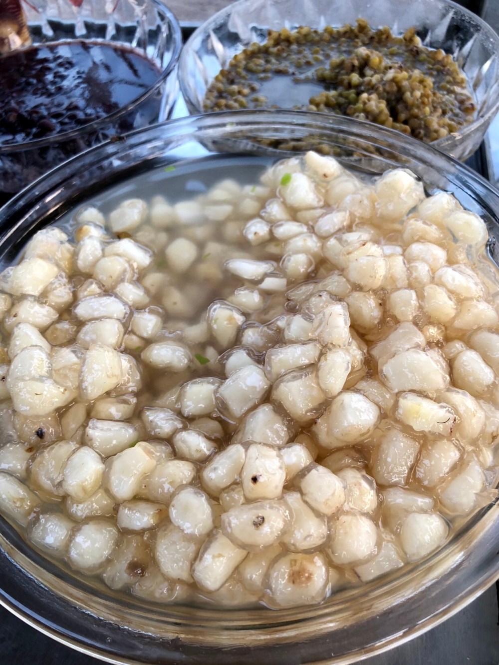 Chè thập cẩm – water chestnuts tapioca, mung beans, and black beans.