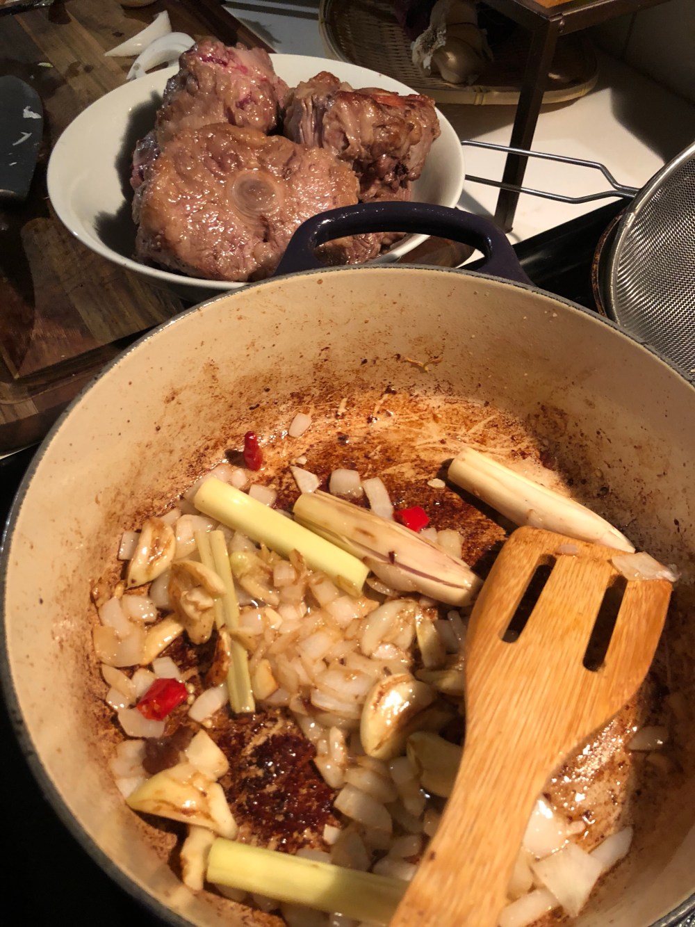 First, brown the beef in a thick pot with some oil then transfer it into a different container. In the same pot, stir-fry the garlic, onion, and lemongrass until they release their aroma and turn into a light brown color, add the meat back in and stir them together. Next, add the seasoning, mix them well together. You can add a cup of water to prevent them to stick to the pot. Next, add some hoisin sauce (some family use fish sauce). Next, add the coconut water with water to cover the meat then let it stew in medium to low heat (at this point, you can transfer them into the slow cooker or the instant pot).