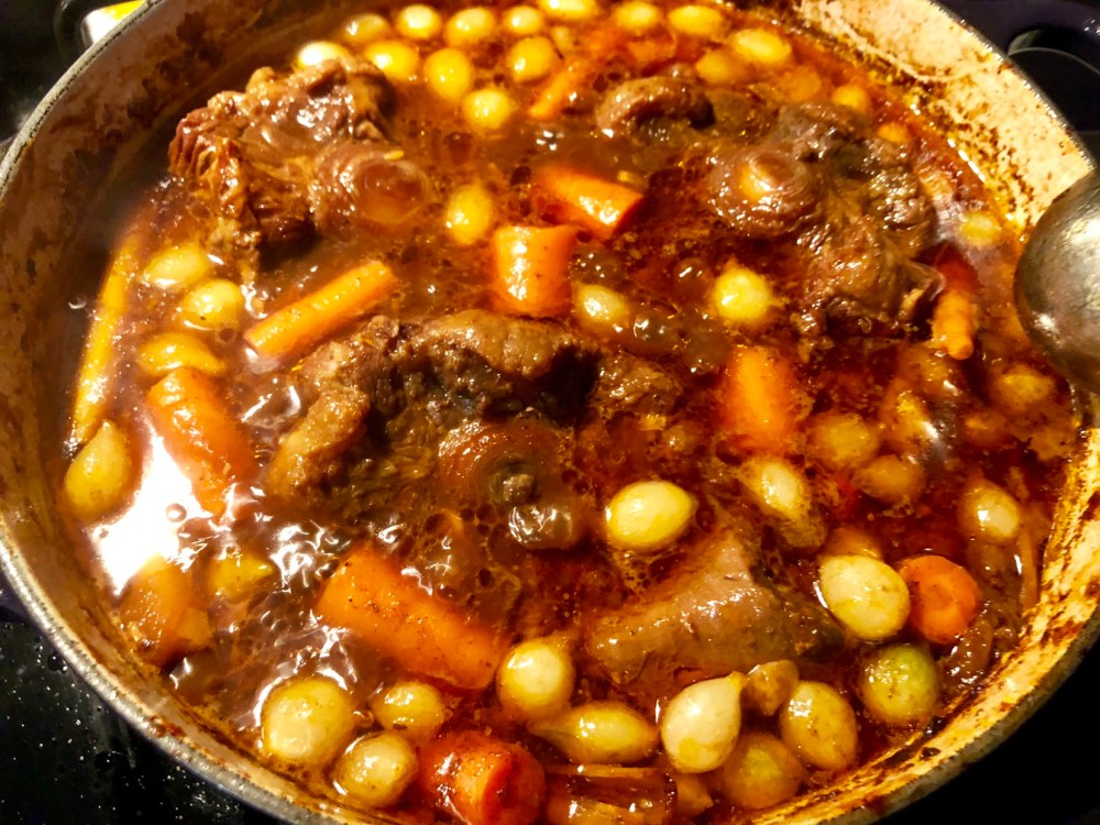 When the meat near to be tendered, add carrots and pearl onions. The cooking time will be different between the type of meats and the cooking devices. Testing it is the only way to tell. Season them again with salt and sugar for a balance taste.