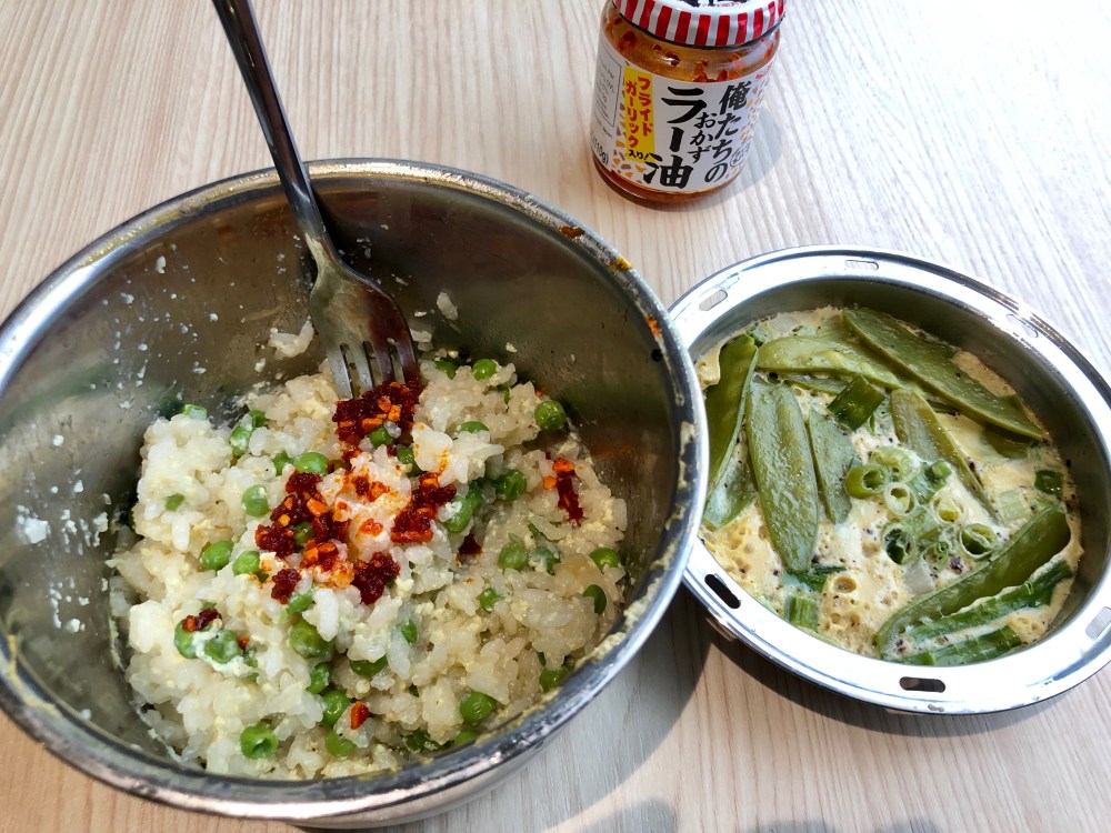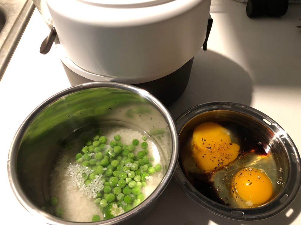 I didn’t have much groceries left when the device delivered to me so I used whichever I had at the time, which was frozen peas, Chinese snow peas, egg, and rice. In the morning, I spent 10 minutes putting this together.