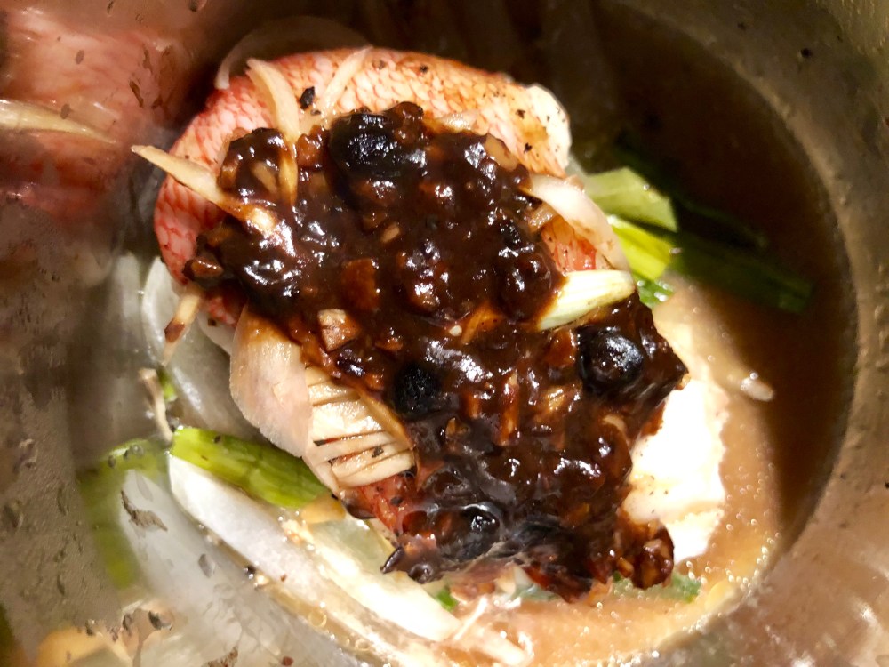 Seasoning the fish with some salt and pepper. I just used a little bit of salt because the black bean sauce was already salty. Drop some oil to the pot then layer the fish on top of green onion, top it with thin slide fingers then black bean sauce. The same for mushroom.