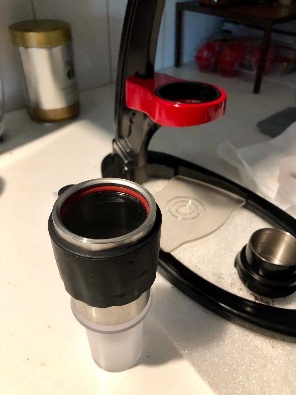 Tamp the coffee down, nice and firm but not too hard. If you feel that it is hard to push down the Flair handle, it means that either your coffee is too fine or you tamp it too hard. Insert the shower screen into the portafilter basket